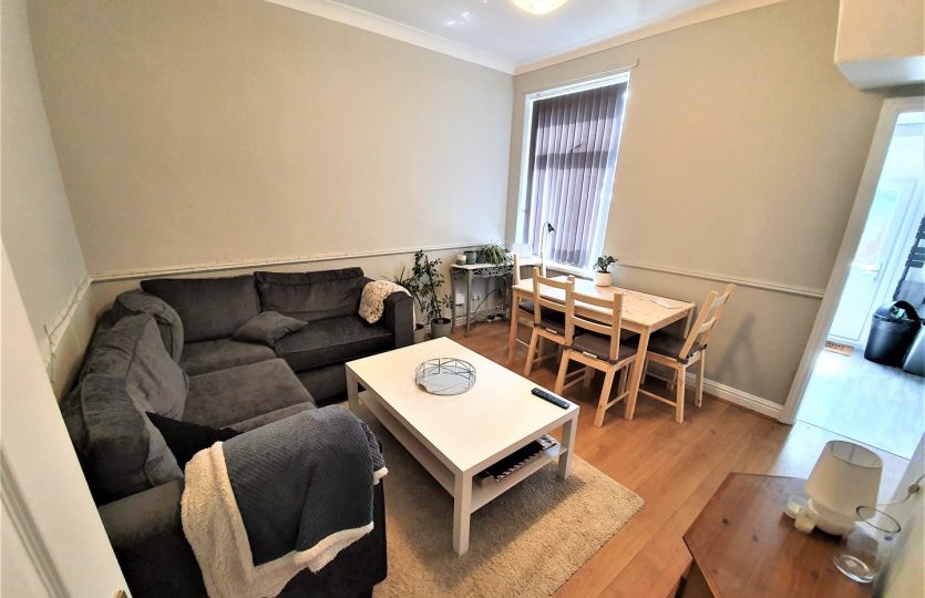 Large living room with laminate flooring, corner sofa, dining table + chairs & large 4k smart tv,