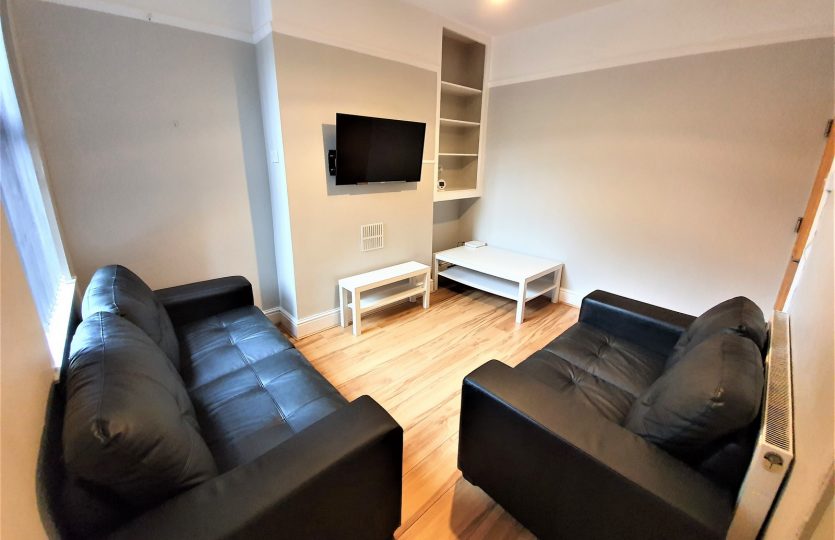 4 bedrooms, laminate floored living room with 50″ smart t.v.