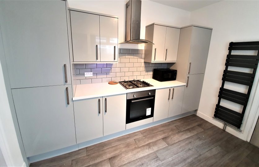Large fully fitted high gloss grey kitchen with 2 built in fridge freezers, oven + hob, microwave, washing machine and separate dryer.