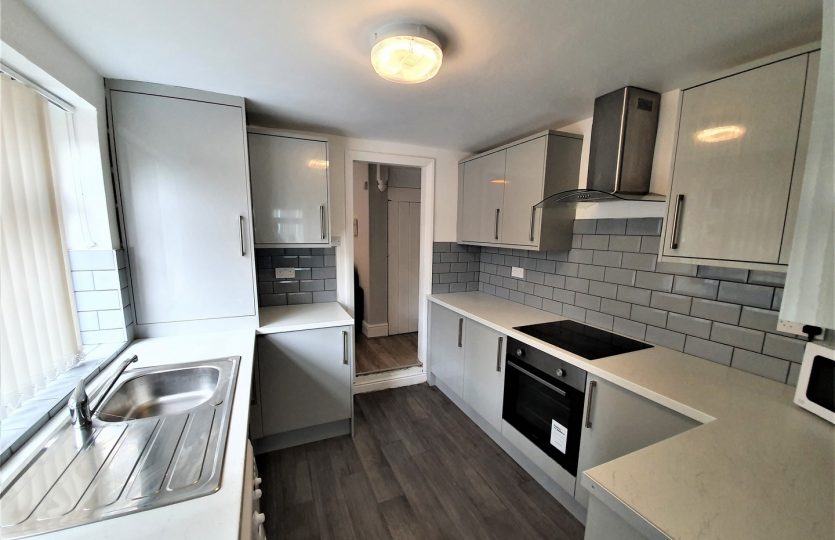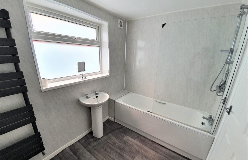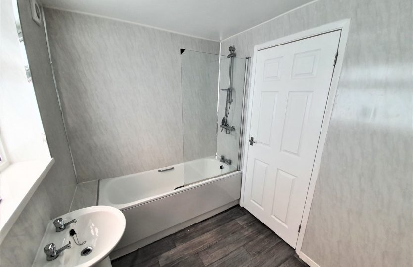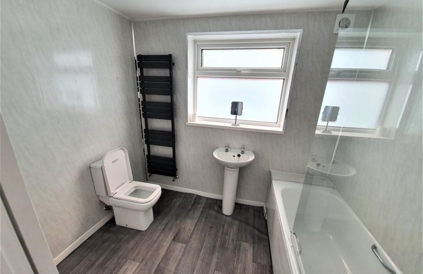 Large modern gloss kitchen and tiled bathroom with bath and shower